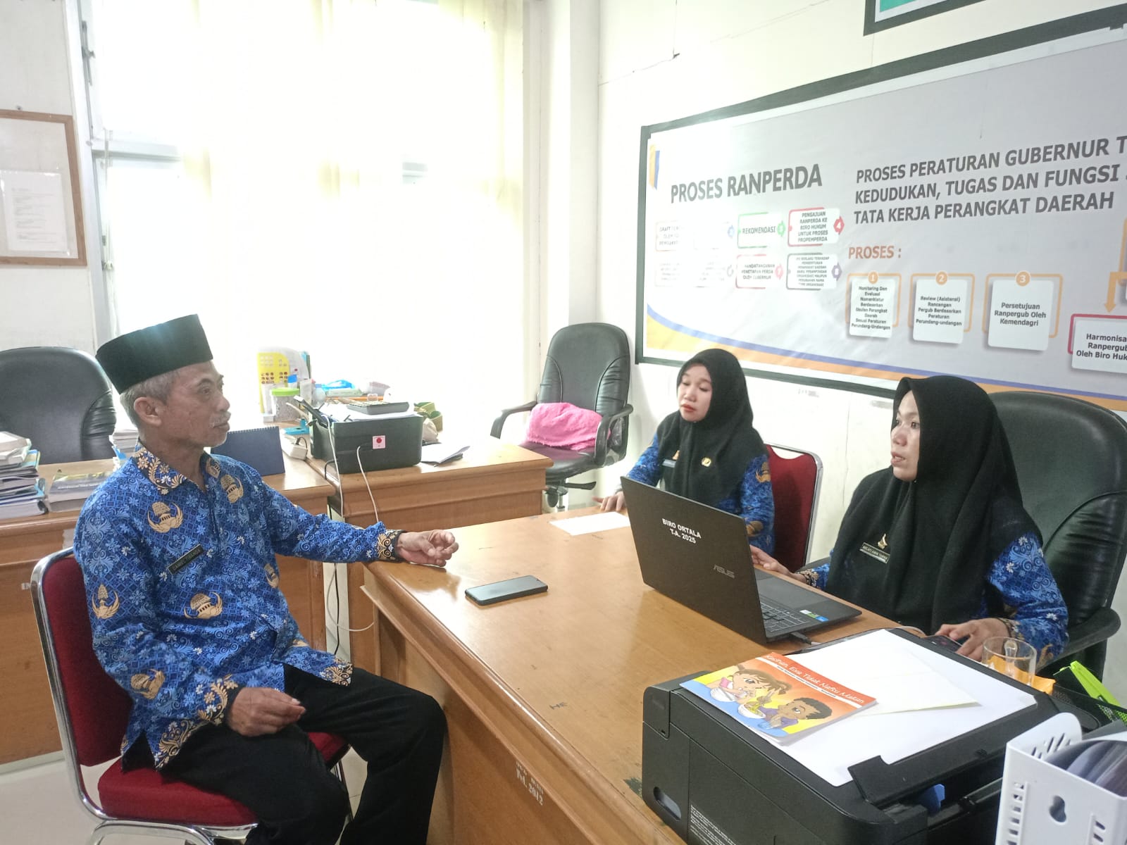 Dalam pertemuan yang berlangsung di Ruang Kerja Bagian Kelembagaan dan Analisa Jabatan tersebut, Kepala Bidang Pembinaan dan Pengawasan Kearsipan Perpusip, Daniel Tiranda diterima Analis Kebijakan Ahli Pertama, Karmila yang mewakil Kepala Biro Organisasi, Nur Rahmah Parampasi.