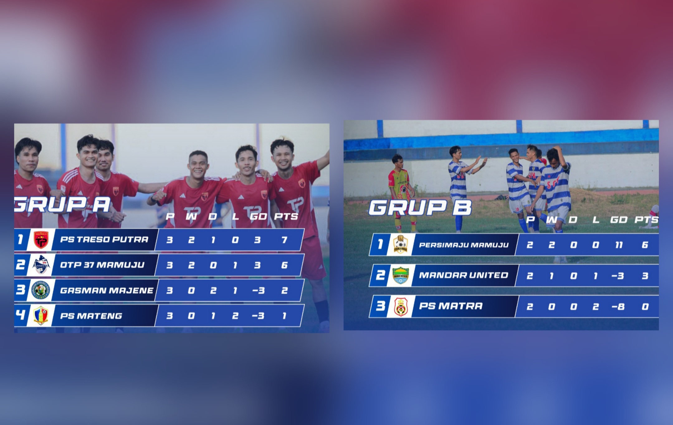 Sementara itu, Gasman Majene harus puas di posisi ketiga dengan 2 poin dari dua hasil imbang dan satu kekalahan. PS Mateng berada di dasar klasemen dengan 1 poin, setelah menelan dua kekalahan dan satu kali seri.