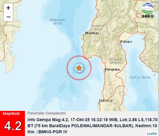 SINARSORE.ID, MAMUJU – Pusat Pengendalian Operasi (Pusdalops) Badan Penanggulangan Bencana Daerah (BPBD) Provinsi Sulawesi Barat menerima informasi dari BMKG Wilayah IV Makassar mengenai gempabumi tektonik berkekuatan Magnitudo 4.2 yang dirasakan di Kabupaten Polewali Mandar, Jumat 17 Oktober 2025, pukul 17.32 WITA.