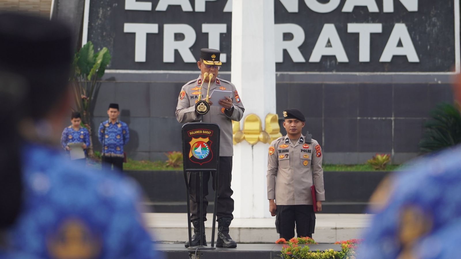 Barisan pasukan dan Pegawai Negeri Sipil (PNS) Polri tampak gagah mengikuti seluruh rangkaian upacara, menunjukkan kebanggaan dan rasa syukur jajaran Polda Sulbar.