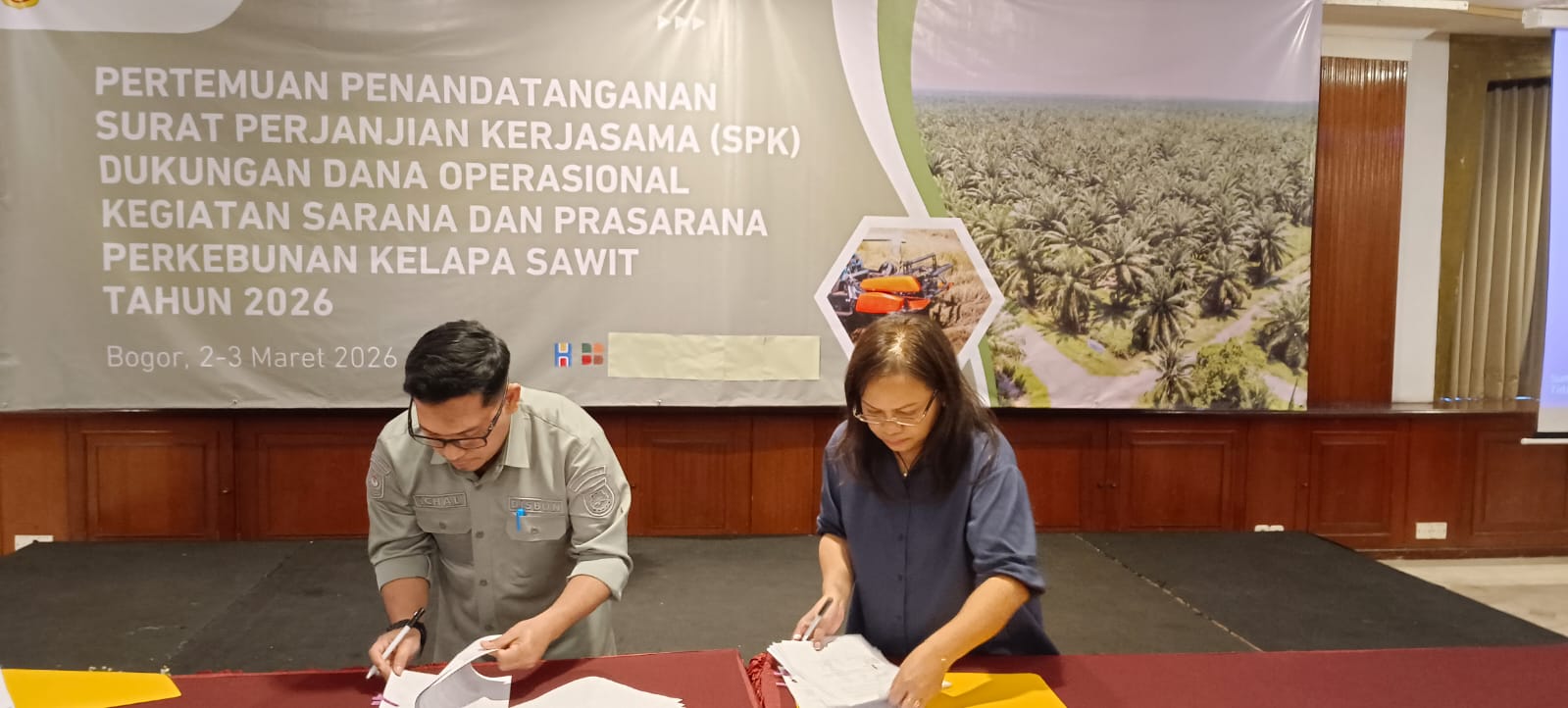 Acara penandatanganan SPK dilakukan dalam Sosialisasi Penyaluran dan Penggunaan Dana Program Sarana dan Prasarana Perkebunan Kelapa Sawit, yang berlangsung di Hotel Salak The Heritage, Bogor, Selasa (3/3/2026).