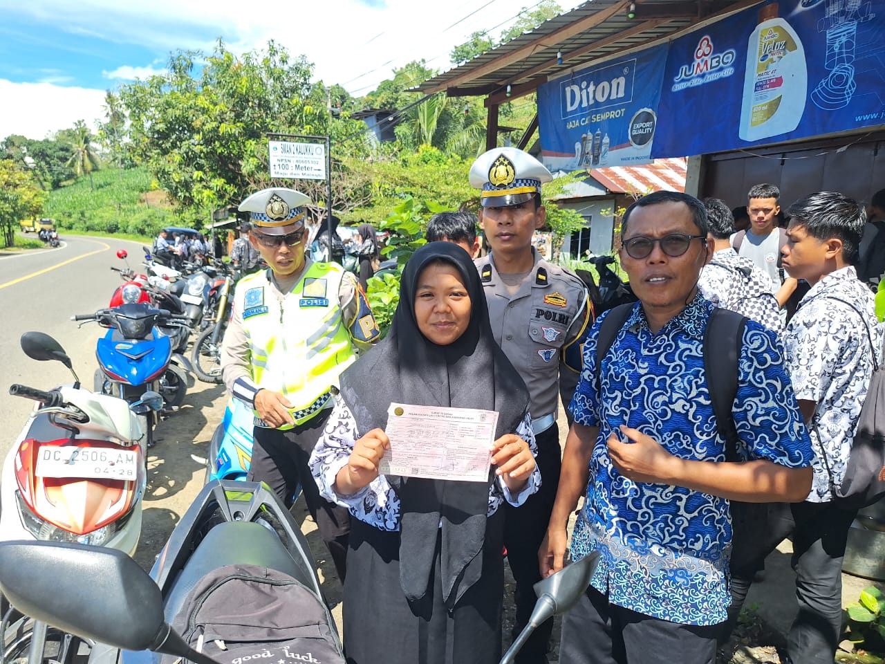 Bagi siswa yang tidak menggunakan helm, diberikan teguran tertulis yang ditandatangani bersama oleh petugas Polantas dan wali kelas sebagai bentuk kolaborasi yang menunjukkan komitmen bersama untuk mengubah perilaku pelajar yang lebih disiplin dan peduli keselamatan.