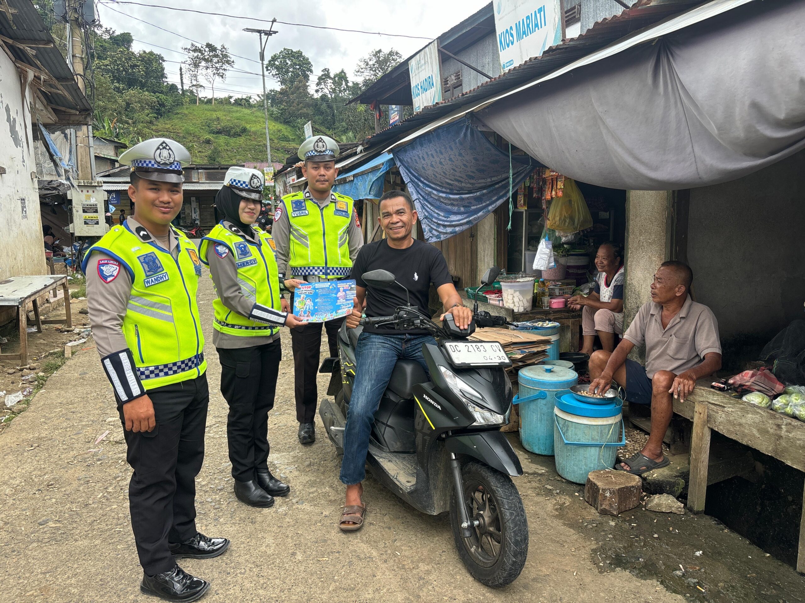 SINARSORE.ID, MAMUJU – Dalam rangka memperkuat komunikasi dengan masyarakat, Personel Lalu Lintas Polda Sulawesi Barat gencar melaksanakan serangkaian kegiatan sosialisasi, pembagian leaflet, serta stiker terkait tertib berlalu lintas kepada para pengendara kendaraan roda dua (R2) dan roda empat (R4) serta masyarakat yang dijumpai.