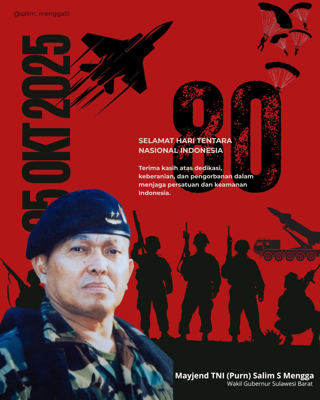 “Dirgahayu ke-80 Tentara Nasional Indonesia. Jayalah selalu TNI, bersama rakyat, demi Indonesia yang kuat dan bermartabat,” tutup Wagub.